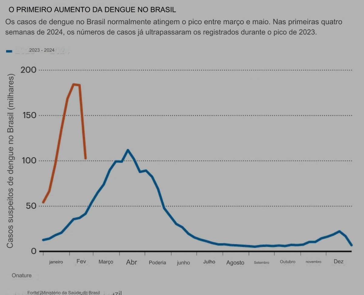 “Nas primeiras cinco semanas deste ano [2024], foram notificados 364.855 casos de infecção, informou o Ministério da Saúde [Brasil], quatro vezes mais do que os casos de dengue no mesmo período de 2023. ”