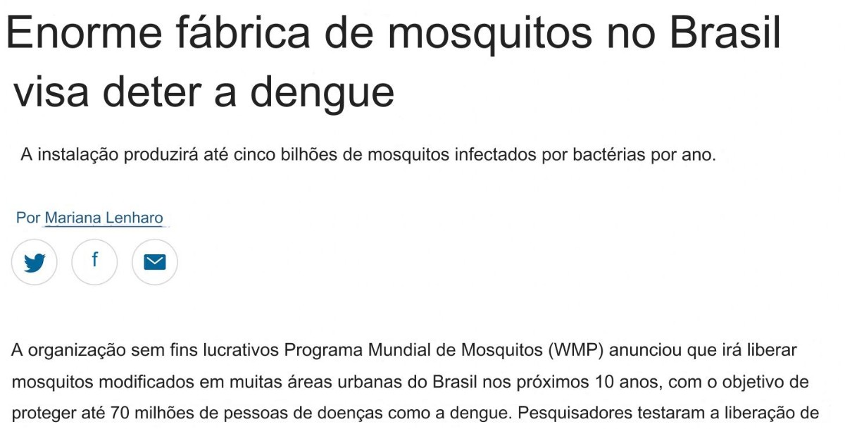 Existe o ditado que o Brasil não é para amadores, mas eu acho que este ditado está muito errado, o brasil não é para profissionais e sim para amadores, somos uma nação sem cultura, sem pessoas que tenha o mínimo de censo critico pra enxergar as barbaridades que os globalistas satânicos querem, essa medida não vai combater mosquito algum, e sim criar novas variantes, como como aconteceu a uma década atrás, que também trouxeram mosquitos, e que até então só existia a dengue e depois surgiu chicungunha e zika vírus.